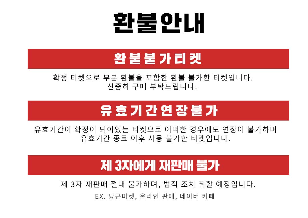 해당 티켓은 한정 특가로 판매되는 상품으로 구매 후 취소/환불이 불가합니다.