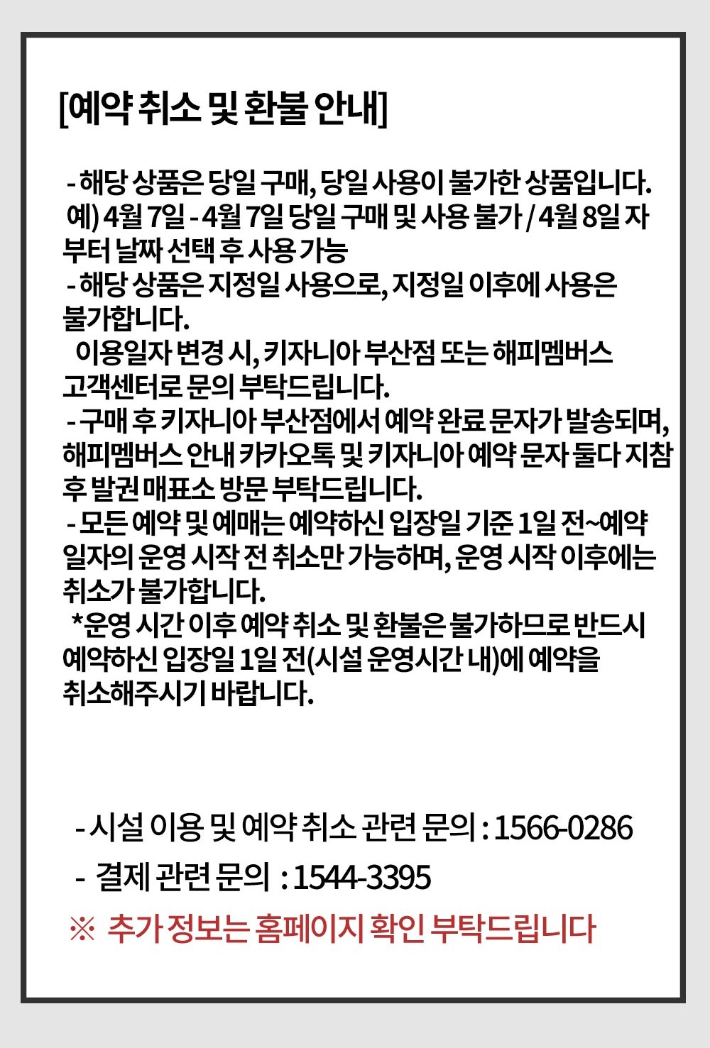 - 구매 후 키자니아 부산점에서 예약 완료 문자가 발송되며, 해피멤버스 안내 카카오톡 및 키자니아 예약 문자 둘다 지참 후